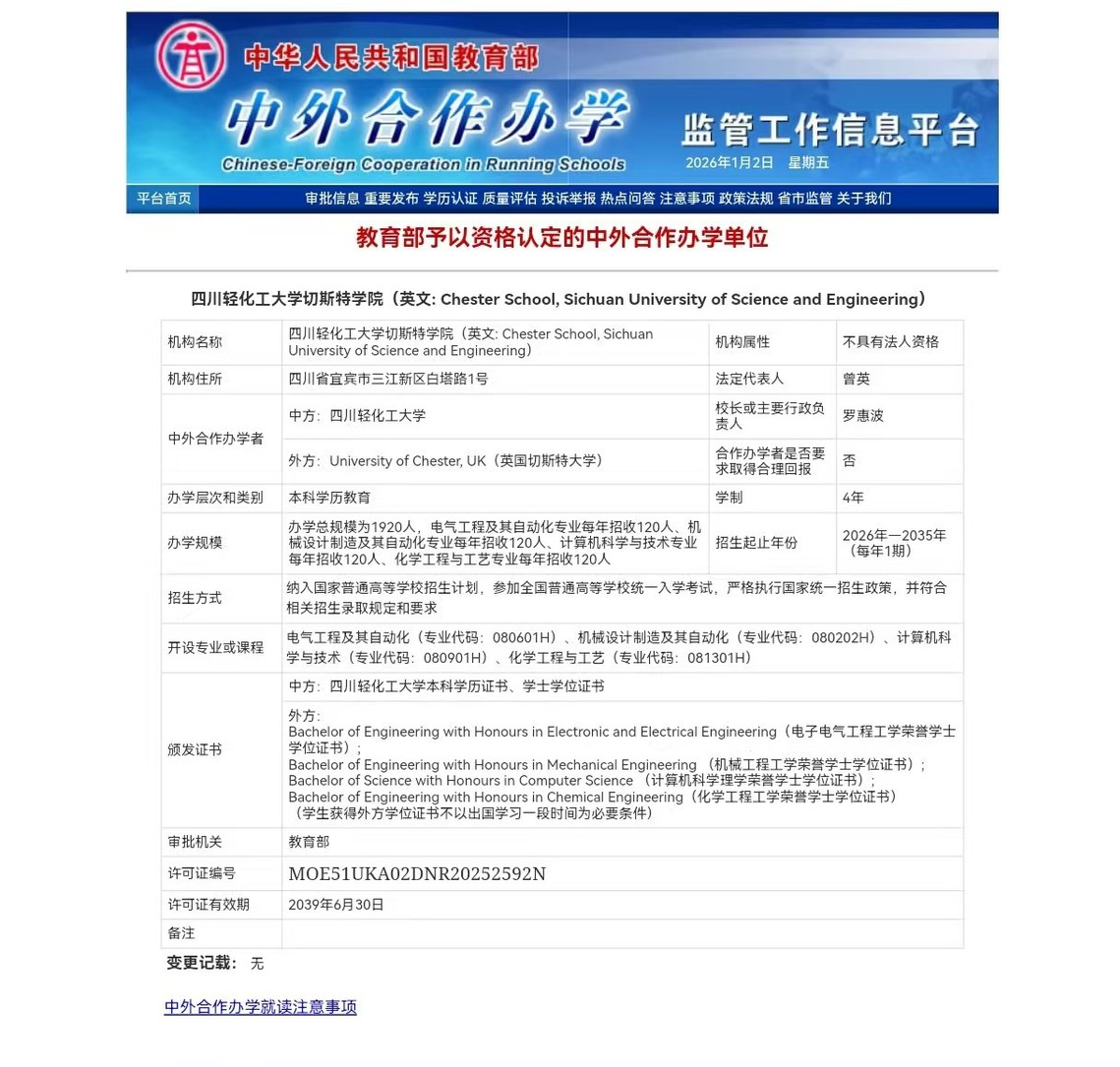 2025年12月31日,教育部公布中外合作办学机构和项目审批结果,我校与英国切斯特大学合作申报的非独立法人中外合作办学机构——四川轻化工大学切斯特学院成功获批。这是学校自2019年首次获批中外合作办学项目以来,首个获批的中外合作办学机构,实现了我校从“合作项目”到“机构共建”的历史性跨越,是学校长期推动教育对外开放、不断深化国际合作交流的重要成果和里程碑,也是学校“在地国际化”又一次“零”的突破!
